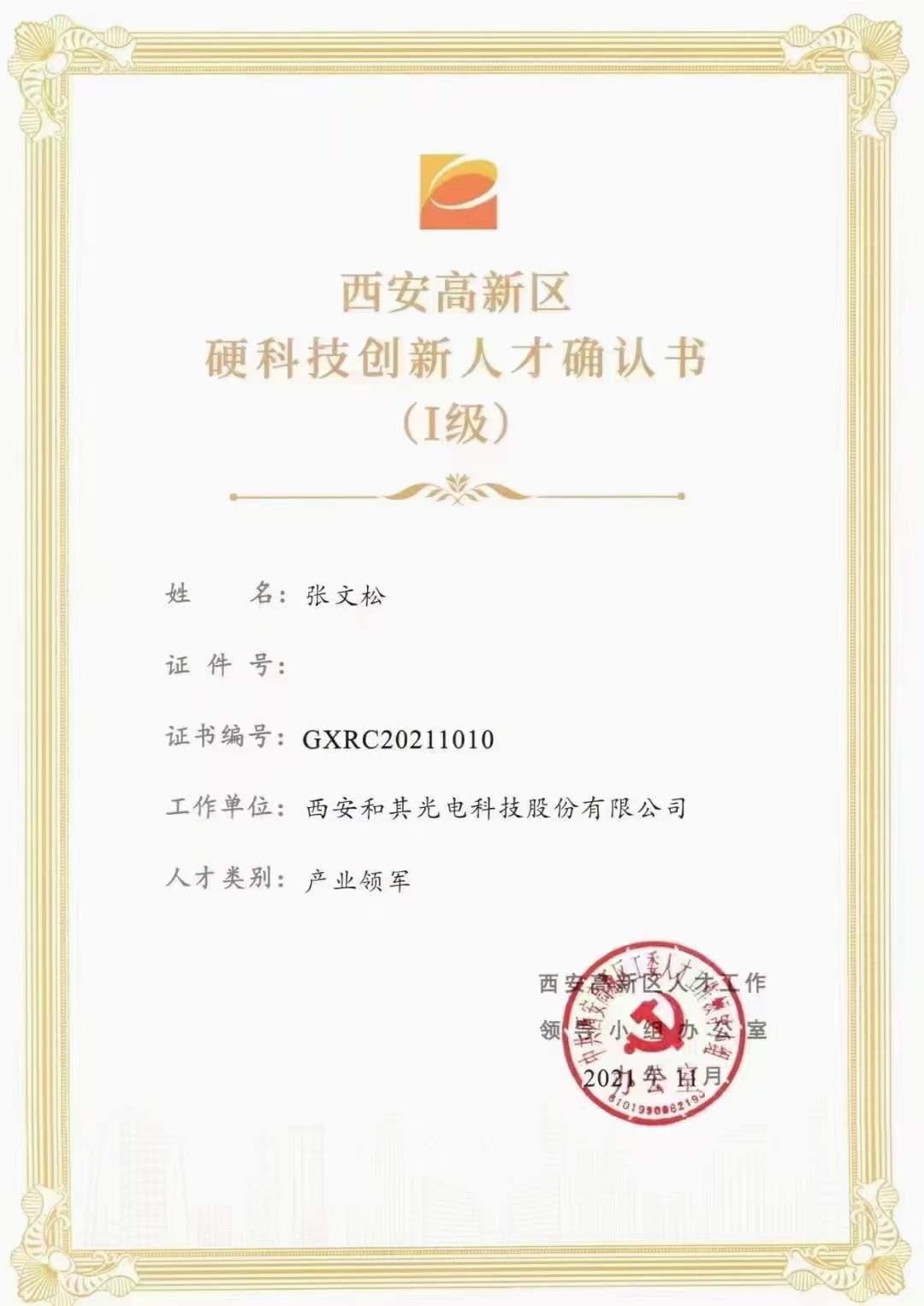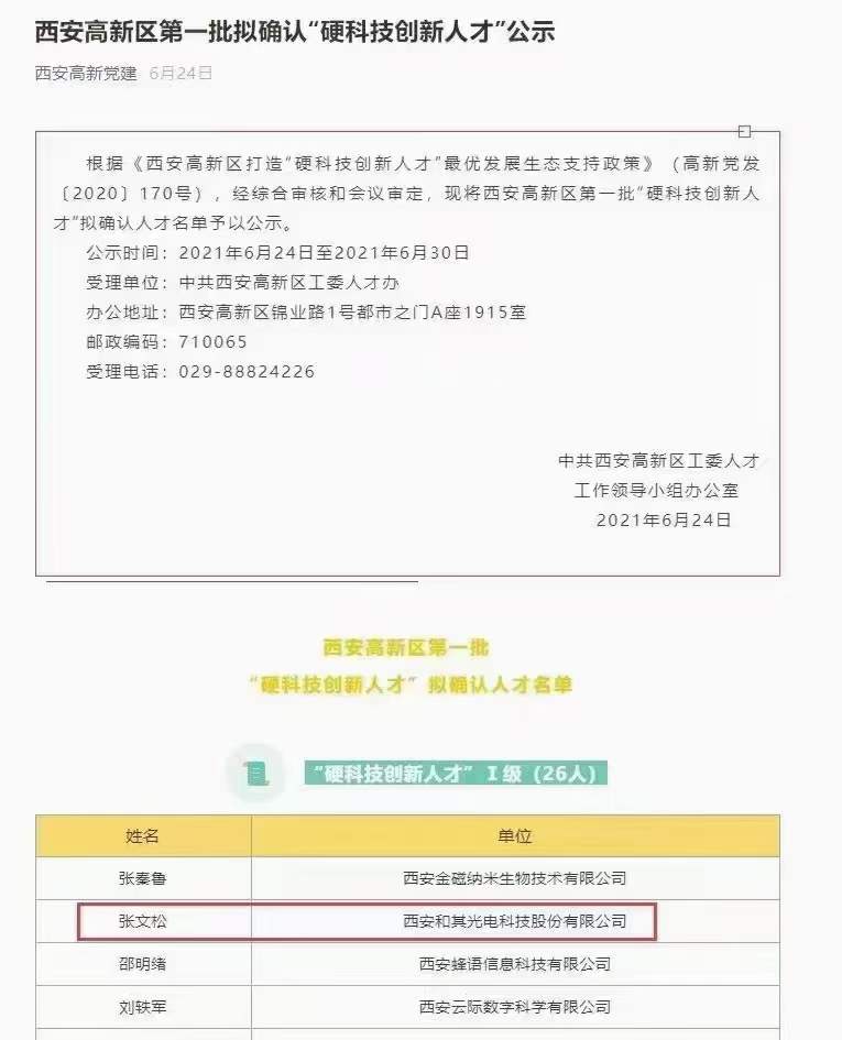 和其光電董事長張文松獲得西安市高新區(qū)硬科技創(chuàng)新Ⅰ級人才。該認(rèn)定參照國家“高層次人才特殊支持計劃”杰出人才標(biāo)準(zhǔn),是對和其光電和人才的極大支持與鼓勵。